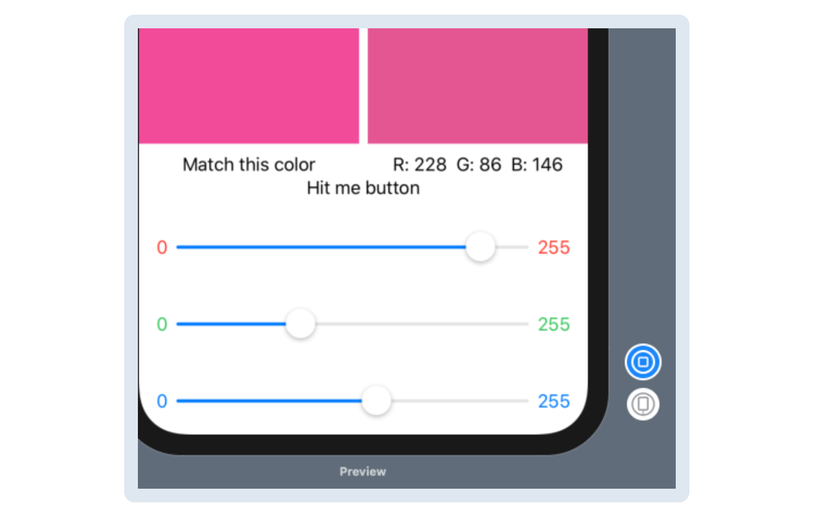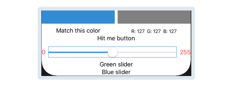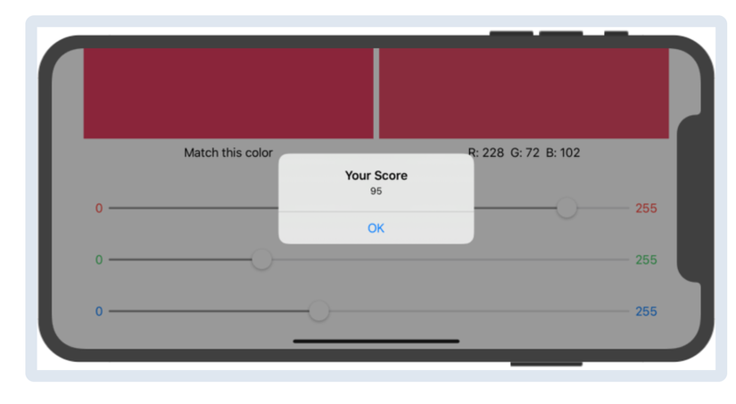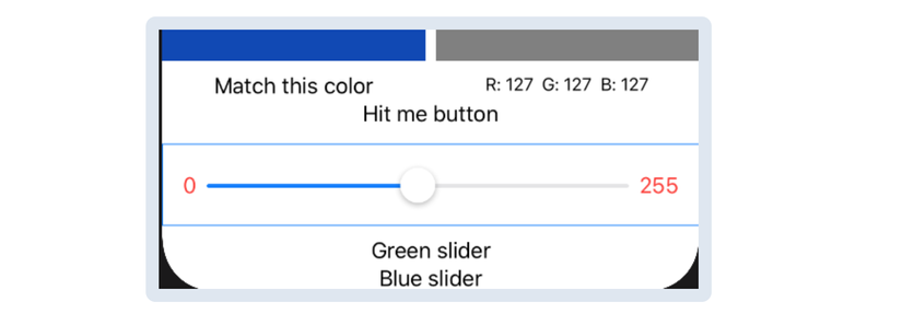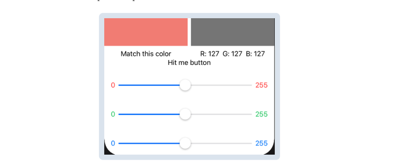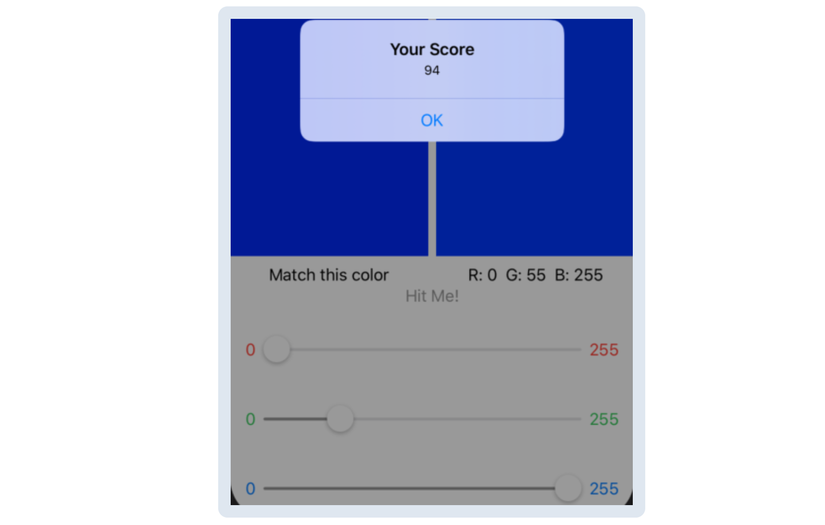 Sau khi sử dụng các thanh slider để có được màu sắc phù hợp, user ấn nút Hit Me, giống như trong trò chơi BullsEye ban đầu.