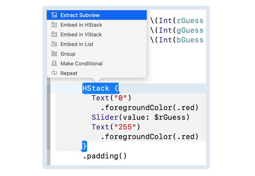 Command-Click vào red slider HStack và chọn Extract Subview: