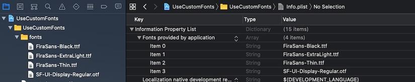 Toàn bộ font bạn muốn sử dụng đã được thêm vào project. Bây giờ, bạn phải khai báo chúng trong file Info.plist để sử dụng trong project của bạn.