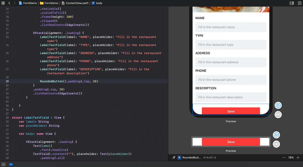 đoạn code này sẽ khởi tạo 1 label có nội dung là "name" và 1 textFeild với place holder là "Fill in the restaurant name".
