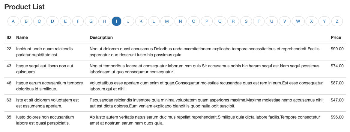 # app/controllers/letters_controller.rb class LettersController < ApplicationController before_action :load_letter, only: :show def index @letters = Letter.all end def show @letters = Letter.all @products = @letter.products end private def load_letter @letter = Letter.find_by char: params[:id] return if @letter flash[:danger] = "Letter not found" redirect_to root_path end end# app/views/letters/index.html.erb <div class="container"> <h3>Letter List</h3> <ul class="pager"> <% @letters.each do |letter| %> <li><%= link_to letter.char.upcase, letter_path(id: letter.char) %></li> <% end %> </ul> </div># app/views/letters/show.html.erb <div class="container"> <h3>Product List</h3> <ul class="pager"> <% @letters.each do |letter| %> <li><%= link_to letter.char.upcase, letter_path(id: letter.char), class: ("active" if params[:id] == letter.char) %></li> <% end %> </ul> <table class="table"> <thead> <tr> <th>ID</th> <th>Name</th> <th>Description</th> <th>Price</th> </tr> </thead> <tbody> <% @products.each do |product| %> <tr> <td><%= product.id %></td> <td><%= product.name %></td> <td><%= product.description %></td> <td><%= number_to_currency product.price %></td> </tr> <% end %> </tbody> </table> </div> -