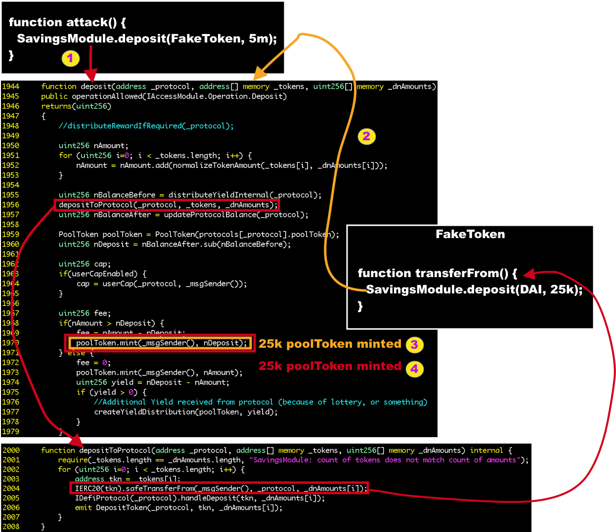 transferFrom()của FakeDai, mà thực chất bên trong hàmtransferFrom()của FakeDai lại gọi lại hàm deposit của SavingsModule (tác hại của việc không dùngnonReentrant) nhưng lúc này lại là dùng DAI thậtdeposit(CurveFiYProtocol, [DAI], [amount]). - SavingsModule mint ra một lượng dDAI tương ứng với việc đã deposit bằng DAI thật
