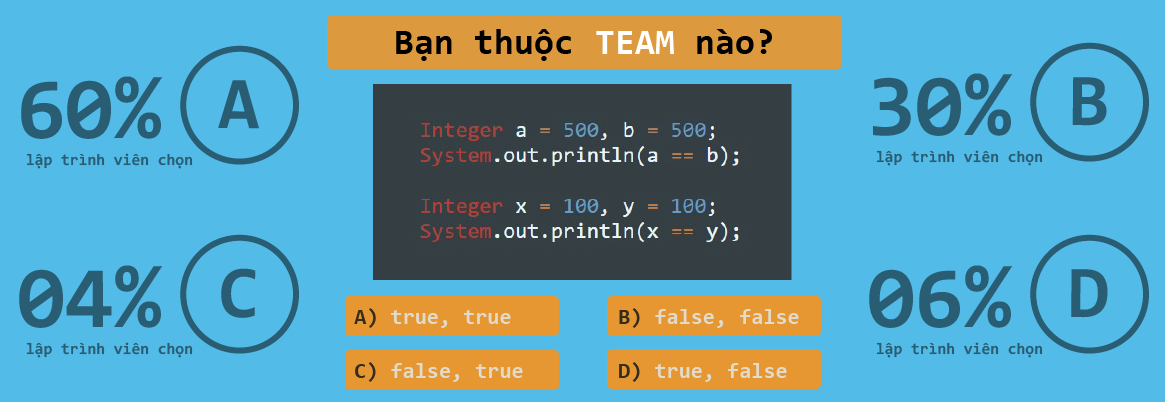 Vậy là anh em chọn A biết mình sai ở đâu rồi, các biến mình dùng ở đây là kiểu Reference Types nên việc anh em sử dụng toán tử "==" để so sánh là anh em đang so sánh hai địa chỉ ô nhớ khác nhau. Và rõ ràng chúng sẽ không thể nào bằng nhau được.