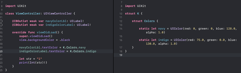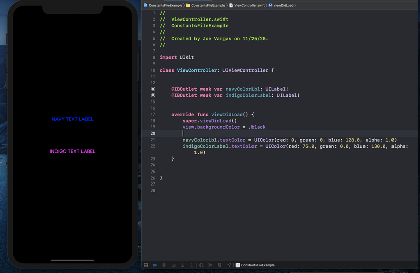 Hãy đưa điều này vào thực tế. Thay vì sử dụng giá trị kết hợp UIColor cho textColor của label, chúng tôi muốn lưu trữ các giá trị màu này vào Constants file để truy cập toàn cục và áp dụng nó cho bất kỳ thành phần UI nào.