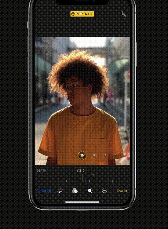 Một trong những tính năng nổi bật trong dòng sản phẩm iPhone 2018 đó là khả năng thay đổi độ sâu trường ảnh (DOF) sau khi chụp. Người dùng có thể di chuyển một thanh khẩu độ (f stops) để làm hậu cảnh mờ hoặc rõ hơn. Nhưng tất nhiên, tính năng này vẫn chỉ là một lớp phủ (mask) giống trong Photoshop chứ không phải vùng mờ thực được tạo ra bởi tính chất vật lí của ống kính.