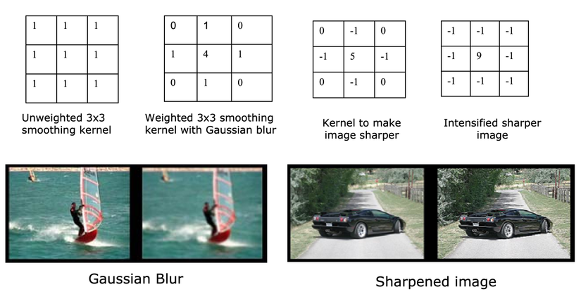 Một số ví dụ về các lớp tích chập cổ điển khác bao gồm filter làm mờ ảnh (Gaussian blur, bên trái) và filter làm sắc nét ảnh (bên phải). Nếu bạn đã dùng các phầm mềm chỉnh sửa ảnh rồi thì sẽ không còn xa lạ gì với các filter này, đúng không?