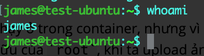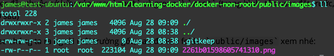 Như các bạn thấy, mặc dù chạy ở trong container, nhưng vì container chạy bằng root, nên tất cả các file trong đó đều thuộc sở hữu của root, khi ta upload ảnh, ảnh này được mount volume ra ngoài và ở môi trường ngoài ta cũng thấy thuộc sở hữu của root luôn, mặc dù môi trường ngoài user của mình tên là james.