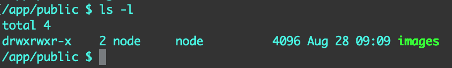Đầu tiên là folder images bên trong public, như mình đã giải thích ở phần trước, folder images được map vào trong với quyền bằng môi trường ngoài do vậy bên trong ta thấy nó có quyền của user node (nhưng chú ý là public thì vẫn thuộc root như ảnh trên nhé)