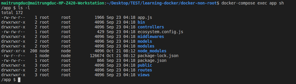 Quay lại phần đầu trong bài mình có viết như sau: "Ở đây chúng ta có điều thú vị đầu tiên 😃. Folder mà chúng ta mount volume ở docker-compose của service app sẽ có quyền bằng với user - người mà chạy docker compose up để khởi động project."