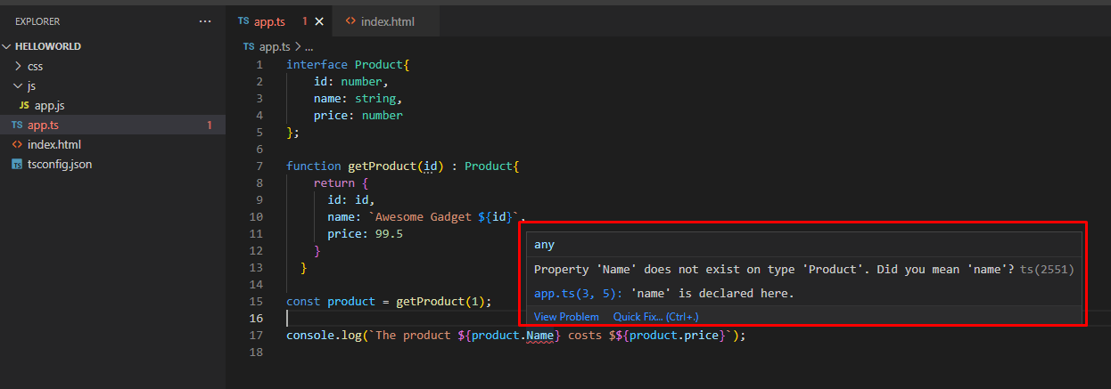 Khi bạn tham chiếu một thuộc tính không tồn tại, trình chỉnh sửa mã(VS Code) sẽ thông báo lỗi cho bạn ngay lập tức: