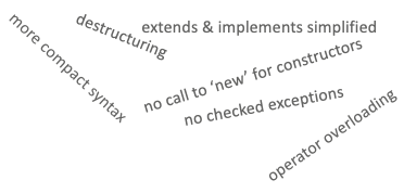 - Không có ngoại lệ nào được kiểm tra - Đối với tôi, đây là một tính năng, nhưng nói chung, đây có vẻ là một chủ đề cho các nhà phát triển Java.