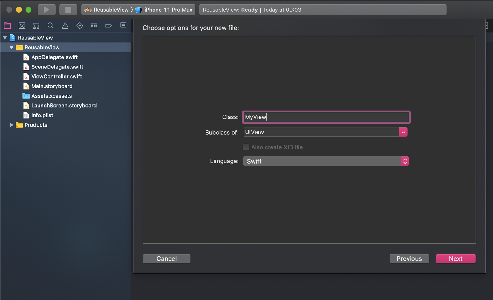 Create a New file → Cocoa Touch Class → Điền tên mà bạn muốn đặt vào. Subclass of UIView. Language: Swift → Next. Select target desired → Create.