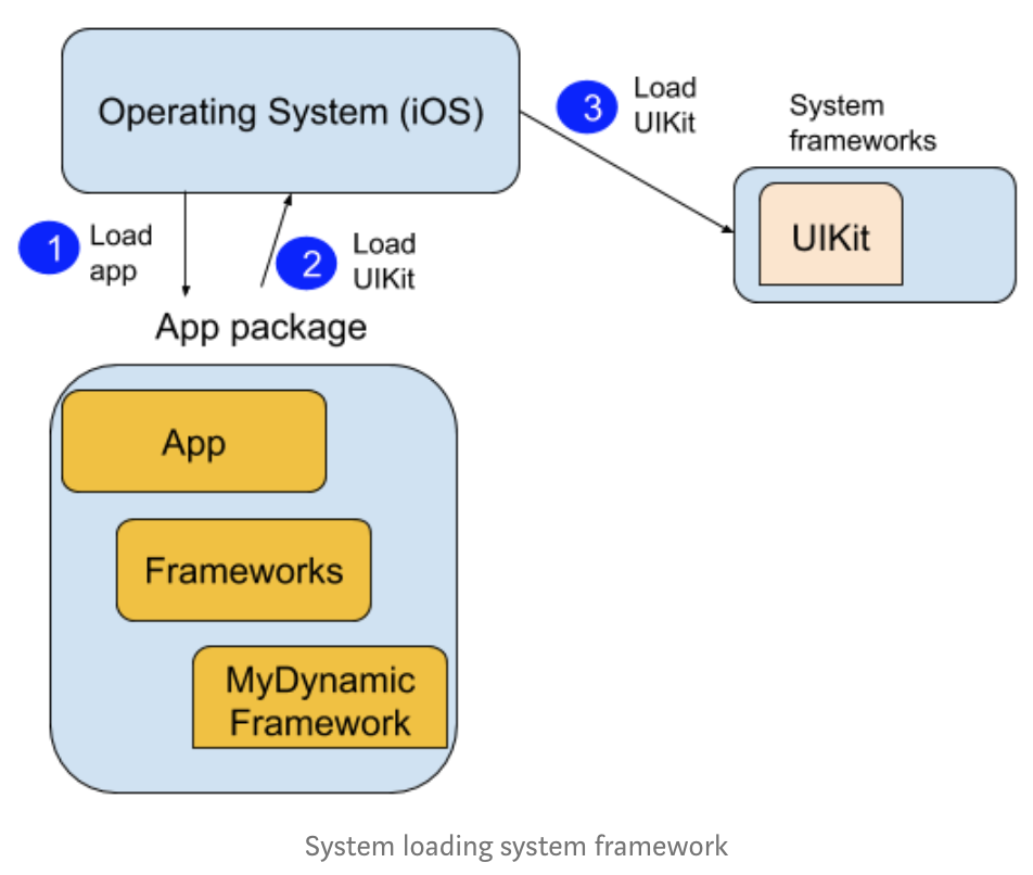 Một ví dụ về điều này là UIKit. Ứng dụng iOS sử dụng UIKit. Tuy nhiên, UIKit không được bao gồm trong mỗi app. Thay vào đó, app có tham chiếu đến nó và chức năng mà nó yêu cầu để hoạt động chứ không phải code thực tế. UIKit được bao gồm trong hệ điều hành. Hệ thống sẽ load UIKit nếu nó chưa được load.