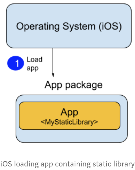 Khi hệ thống load app, chức năng static library được load cùng với nó dưới dạng thực thi duy nhất.