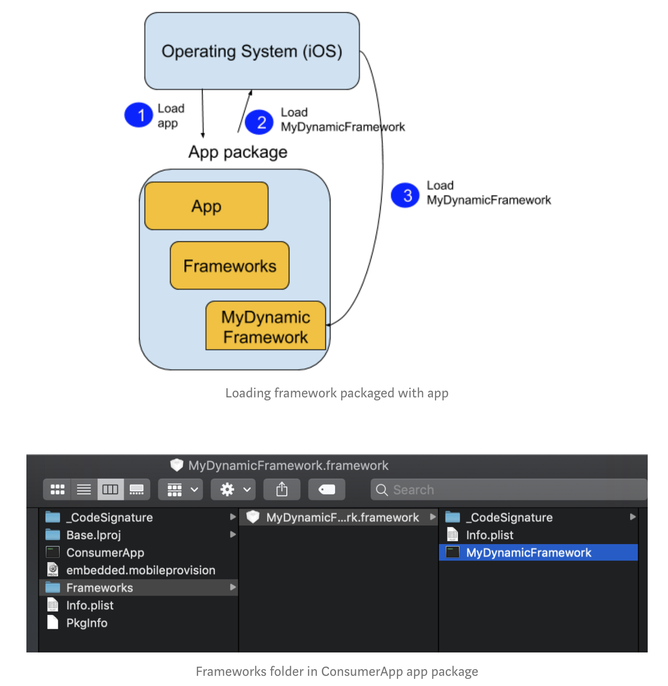 ConsumerApp không thể làm việc mà không cần MyDocateFramework nếu không nó sẽ bị crash. Do đó hệ thống phải load nó. Do đó, nó phải được bao gồm trong app package. Xcode tạo một folder trong app package có tên là Frameworks. Folder này là nơi lưu trữ các dynamic framework mà app yêu cầu.
