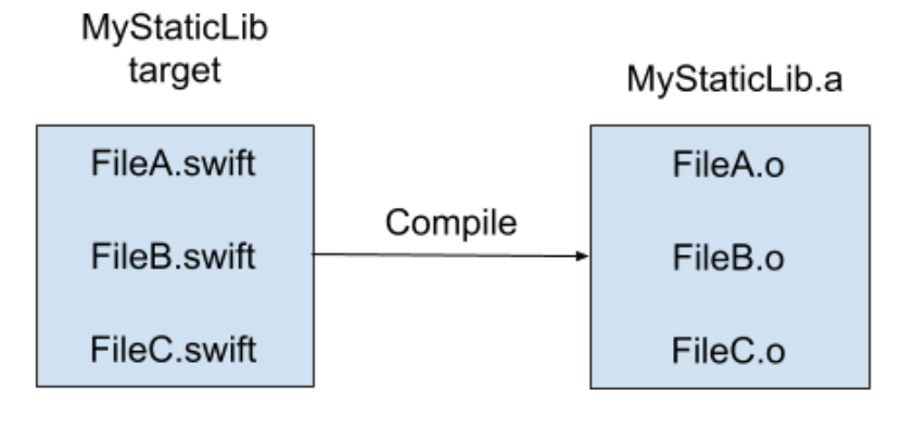 Một Static library là một tập hợp các tệp mã nguồn được biên dịch. Ở ví dụ dứi đây ta có FileA.swift, FileB.swift và FileC.swift. Với static library, chúng ta có thể biên dịch các file này và wrap chúng trong một file duy nhất, có extension là .a, viết tắt của archive