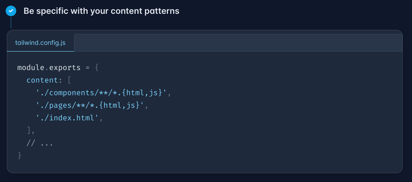 Content : nơi mà postCss sẽ quét các class names, vậy nên càng quét rộng càng load lâu, càng chỉ định rõ ràng path càng tốt