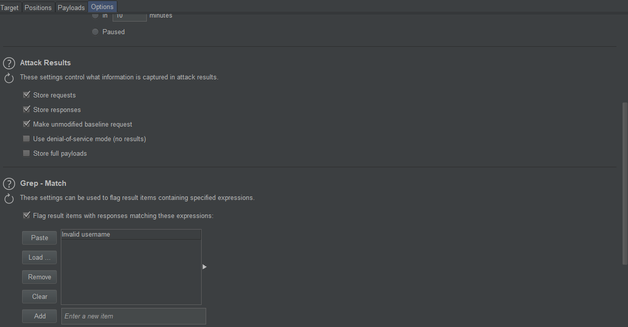 Tiếp tục chuyển sang tab Options. Tại Grep-Match chọn clear, sau đó ta thêm Invalid username vào và chọn Add: