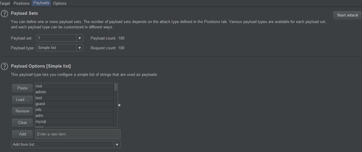 Quay lại bài, chuyển sang tab Payloads, tại Payload Options chọn paste username đã lấy ta được:
