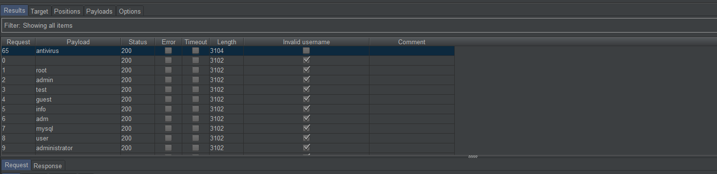 Việc này sẽ khiến kết quả trả về thực hiện kiểm tra trong response có ký tự Invalid username hay không. Thực hiện attack và đợi kết quả trả về: