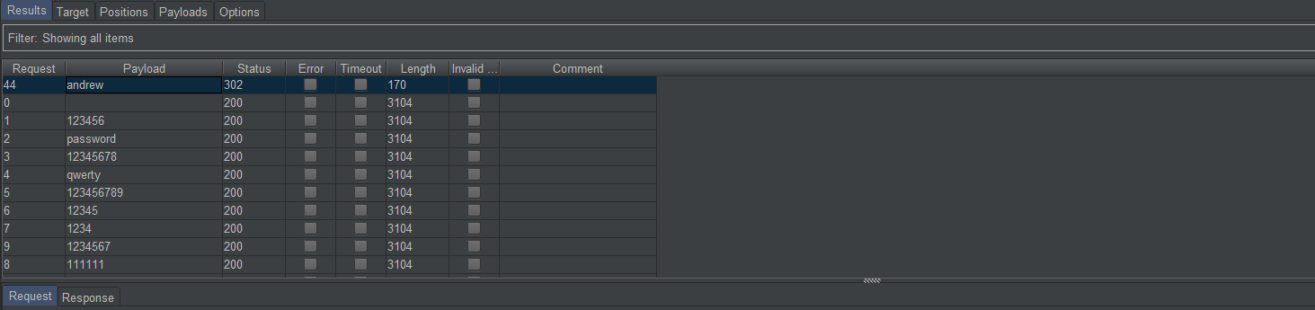 Thông thường khi đăng nhập thành công thì trang web sẽ tự động chuyển hướng sang trang chủ khai thác. Vì thế kết quả tại cột Status sẽ trả về là 302. Dựa vào đó ta thu được password=andrew.