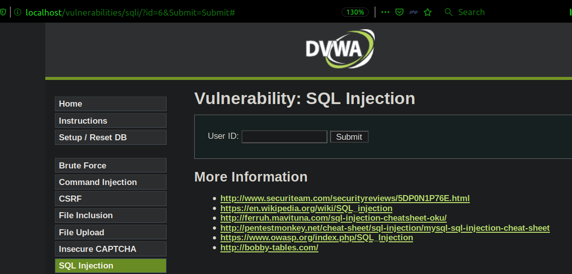 Để ý trong URL ở 2 hình trên, hình 1 mình nhập vào ID=1 và hình 2 mình nhập ID=6 kết quả của 2 hình khác nhau. Một thằng cho ra thông tin còn 1 thằng thì không.