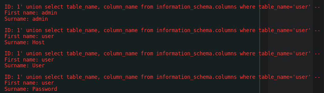 Sử dụng các đoạn payload phù hợp, mình đã in ra thông tin tên các cột trong bảng users.