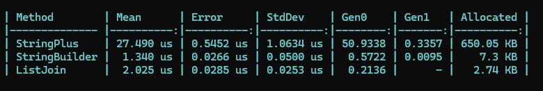 - Về tốc độ (Mean Time): Cách dùng StringPlus chậm gấp 20 lần so với StringBuilder. Chậm gấp 13 lần so với string.Join.