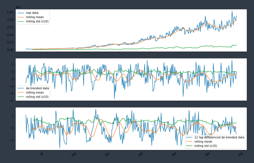- De-trending (thủ tiêu xu hướng): như tên gọi, loại bỏ các khu vực mang yếu tố xu hướng trong chuỗi. Việc loại bỏ có nhiều cách, phụ thuộc vào bản chất của dữ liệu: index hay non-index.