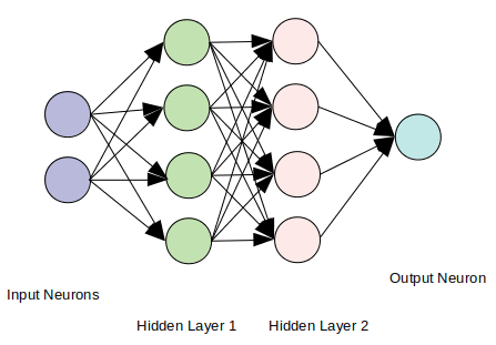 Ví dụ như mô hình trên đây ta có số hidden layer bằng 2. Và tất nhiên hàm loss trong bài toán phân loại là cross-entropy: