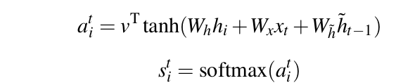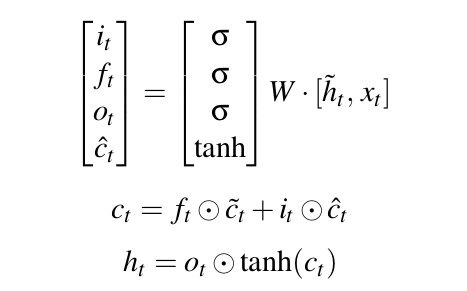 Sau đó ta tính các giá trị cell state và hidden state ở timestep t tương tự như mô hình LSTM chuẩn. Điều tạo nên sự khác biệt ở đây là thay vì đầu vào nhận cell state và hidden state thông thường trước đó thì bây giờ LSTMN đã nhận đầu vào là các cell state, hidden state "xịn xò" hơn mang nhiều thông tin hơn.