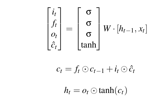Theo công thức trên ta có thể thấy, cell state ở timestep t được tính dựa trên forget gate quyết định lấy bao nhiêu cell state trước và input gate sẽ quyết định lấy bao nhiêu từ input của state và hidden layer của layer trước. Và output gate quyết định xem cần lấy bao nhiêu từ cell state để trở thành output của hidden state. Các bạn có thể tham khảo chi tiết kiến thức mô hình LSTM tại blog của anh Tuấn Nguyễn nhé.