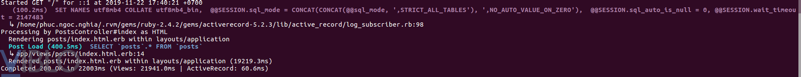 ActiveRecord mất 60.6ms để thực hiện câu lệnh sql và Views mất 21941.0ms để hiển thị. Như vậy ta có thể thấy rằng ứng dụng của chúng ta chạy rất chậm. Nào bh chúng ta cùng tối ưu chúng nhé.