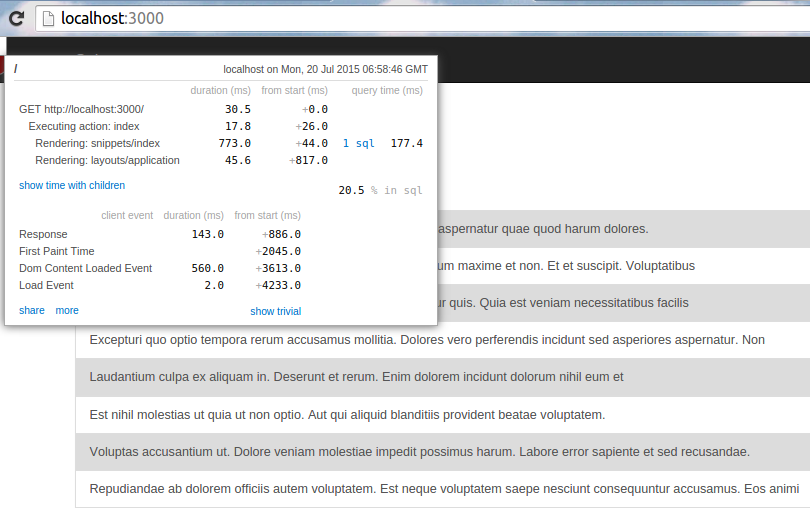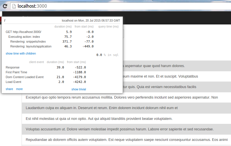 Chúng ta sử dụng gem rack-mini-profiler để đo tốc độ tải trang và gem Faker để tạo dữ liệu ảo. Thêm 2 dòng sau vào Gemfile: