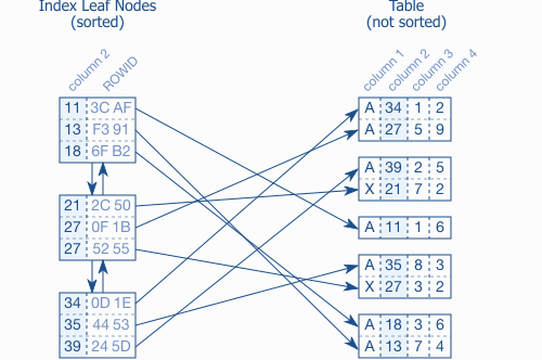 Trong hình trên mô tả index leaf nodes và liên kết của nó với table data, mỗi cục index bao gồm một index column(key, column2) và một liên kết tương ứng tới table row (qua ROWID hoặc RID). Khác với index, table được lưu trong heap nên chả có tý thứ tự nào. Các row trong cùng một block lẫn ở các block khác nhau cũng không có tý liên hệ nào với nhau cả.