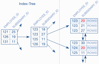 Nhìn chung index kết hợp cũng vẫn là B-Tree để giữ các cục index được sắp xếp theo thứ tự như index 1 trường. Nhưng vì có hai trường nên database sắp xếp ưu tiên trường được đánh index đầu tiên trước (EMPLOYEE_ID) rồi sau đó sắp xếp tới các trường sau (SUBSIDIARY_ID). Cái này sắp sếp giống như trong danh bạ điện thoại Tên đứng trước, Họ đứng sau, thứ tự trường thứ hai chỉ có nếu trường thứ nhất có giá trị bằng nhau, nếu không về cơ bản sẽ không có thứ tự. Nghĩa là index không hỗ trợ tìm kiếm theo trường thứ hai, giống như việc tìm danh bạ theo HỌ vậy (cái này mình nói quyển danh bạ ngày xưa chứ giờ tra IPhone thì cái gì nó chả ra, hoặc ví dụ khác là các bạn tìm kiếm từ điển bằng chữ cái thứ hai vậy)