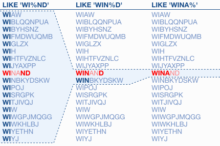 Điều gì sẽ xảy ra nếu như bạn để dấu % ở đầu tiên. Nếu để như vậy nếu không có điều kiện nào bổ xung thì bạn sẽ phải duyệt toàn bộ bảng để trả về kết quả, vì vậy kết quả của WINA% sẽ rất khác biệt %WINA các bạn nên tránh trường hợp để wildcard ở đầu. Về lý thuyết vị trí của wild card sẽ ảnh hưởng tới hiệu năng khi tìm kiếm theo LIKE. Trong thực tế trình tối ưu còn dựa vào bind parameters để đoán xem có toán tử like ở đầu không (trường hợp này duyệt toàn bộ)