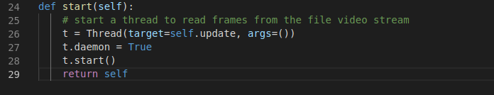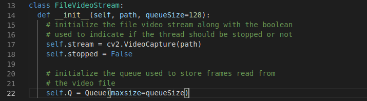 Khởi tạo đối tượng FileVideoStream và bắt đầu chuỗi đọc frame (Dòng 19).