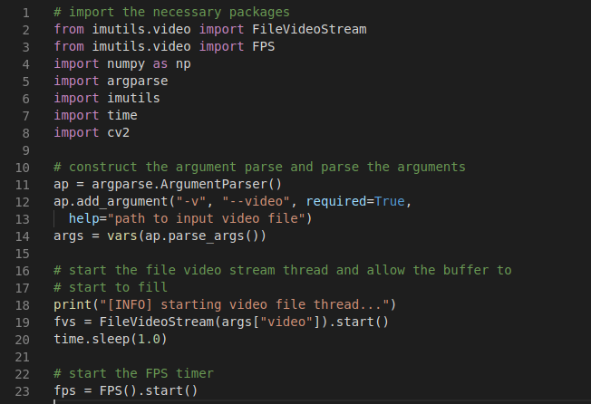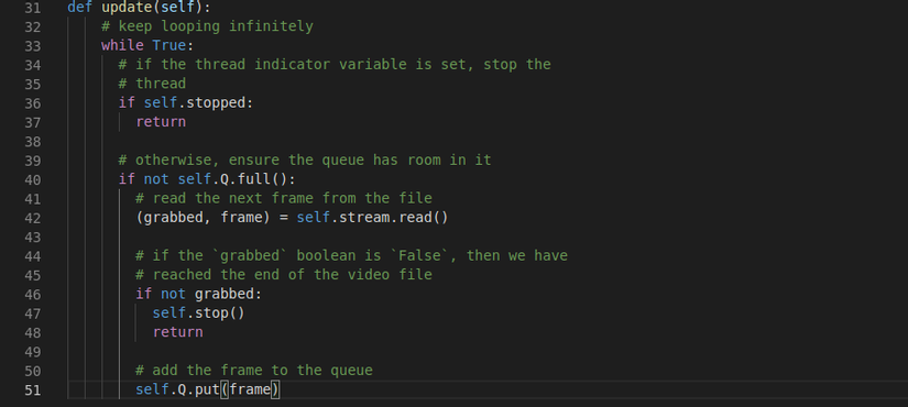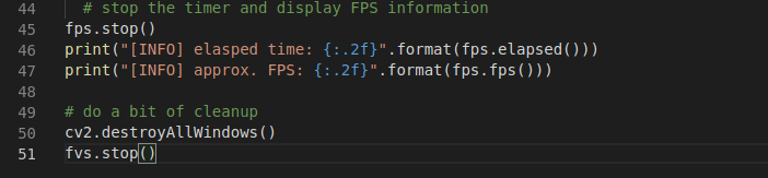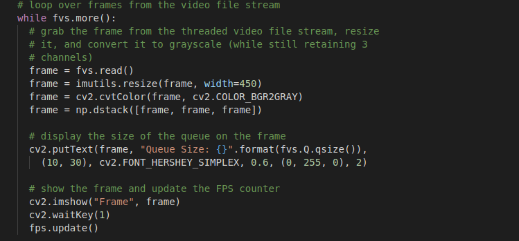 Bắt đầu một vòng lặp while trên dòng 24 sẽ tiếp tục lấy các frame từ hàng đợi FileVideoStream cho đến khi hàng đợi trống.