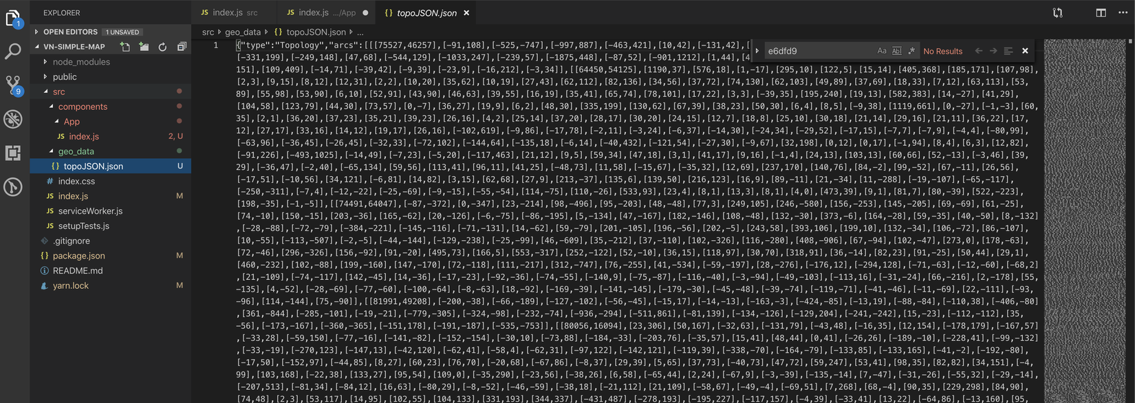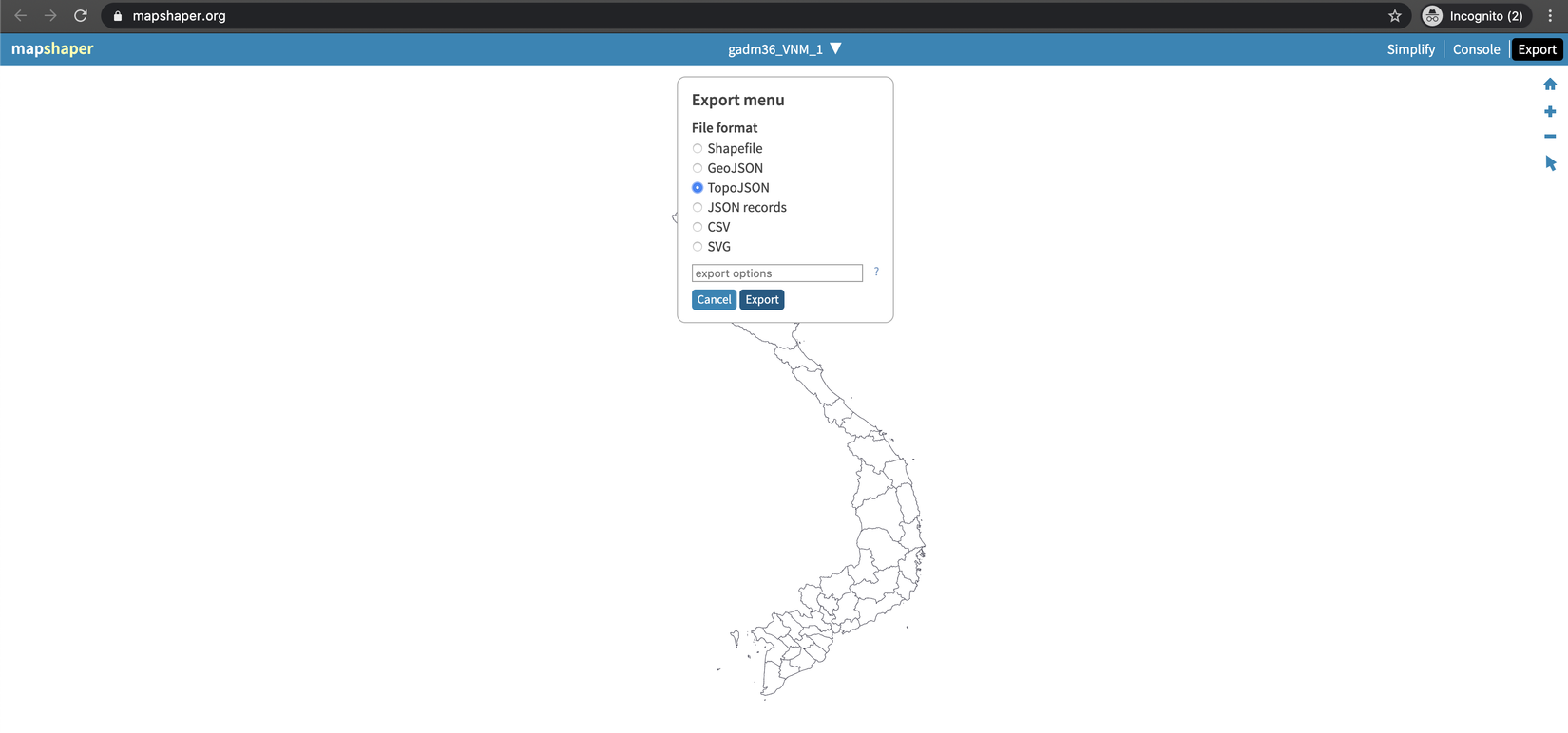 Ở trang http://mapshaper.org/ mình export sang file topoJSON và để nó vào thư mục geo_data trong project. Đây chính là file chứa toạ độ các đỉnh để vẽ nên bản đồ nước ta.