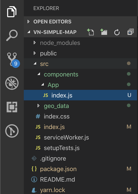 Đây là cấu trúc thư mục của mình với component App (file index.js trong folder App) là nơi mình thực hiện vẽ bản đồ đất liền nước ta: