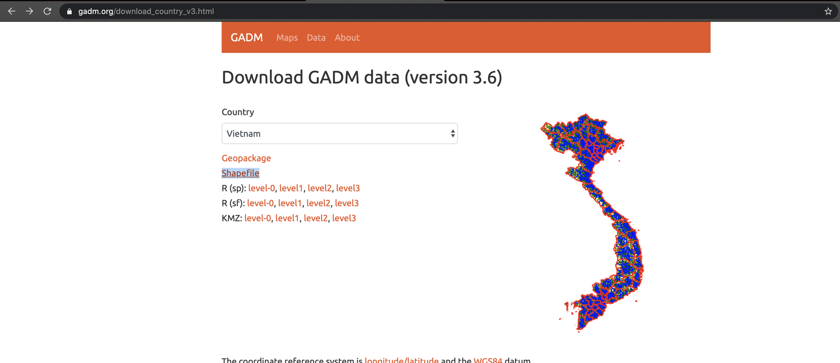 Chọn nước Việt Nam mình rồi click vô Shapefile để download file toạ độ: