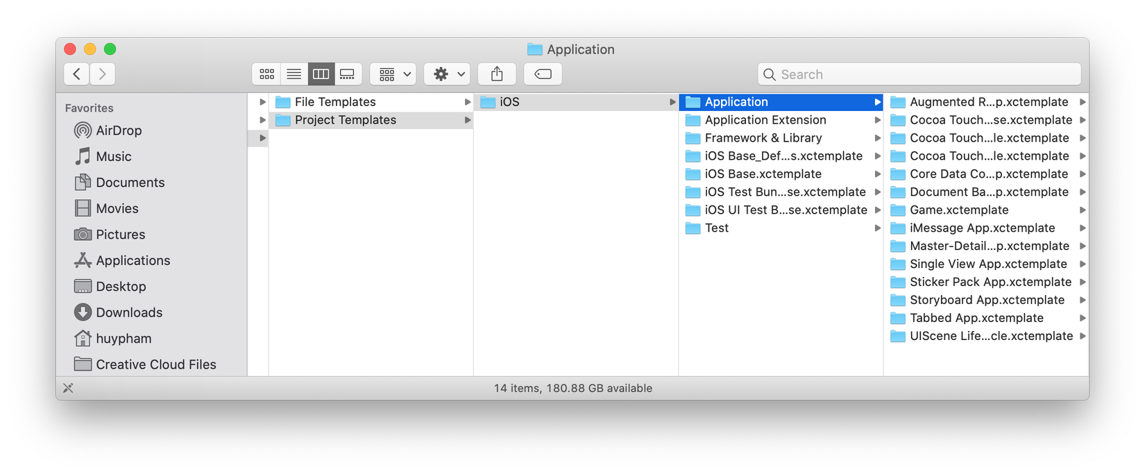 com.apple.dt.unit.coreDataCocoaTouchApplicationmà ta có thể tìm thấy tại/Applications/Xcode.app/Contents/Developer/Platforms/iPhoneOS.platform/Developer/Library/Xcode/Templates/Project\ Templates/iOS/Application/Core\ Data\ Cocoa\ Touch\ App.xctemplatecom.apple.dt.unit.sceneLifecycleApplicationmà ta có thể tìm thấy tại/Applications/Xcode.app/Contents/Developer/Platforms/iPhoneOS.platform/Developer/Library/Xcode/Templates/Project\ Templates/iOS/Application/UIScene\ Lifecycle.xctemplate