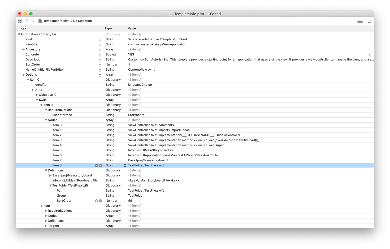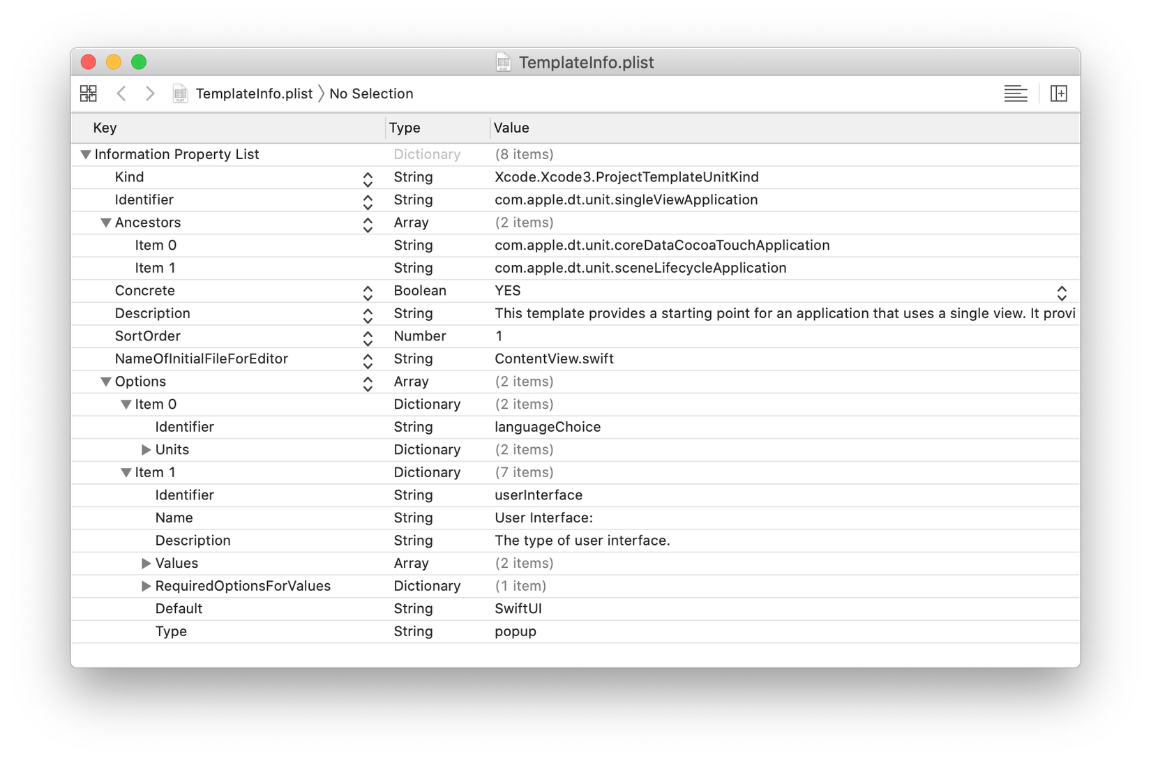 Truy xuất thông tin trong TemplateInfo.plist, bạn sẽ thấy xuất hiện các thẻ Nodes và Definitions, đây là hai thẻ để chúng ta có thể định nghĩa các file và folder sẽ có trong project. Các thẻ này có lúc nằm ngoài, nhưng cũng có lúc nằm khá sâu trong các option, bởi vì thực tế tùy theo từng lựa chọn ngôn ngữ Objective-C hay Swift, SwiftUI hay Storyboard mà khi đó các file và folder được thiết lập sẵn sẽ khác nhau.