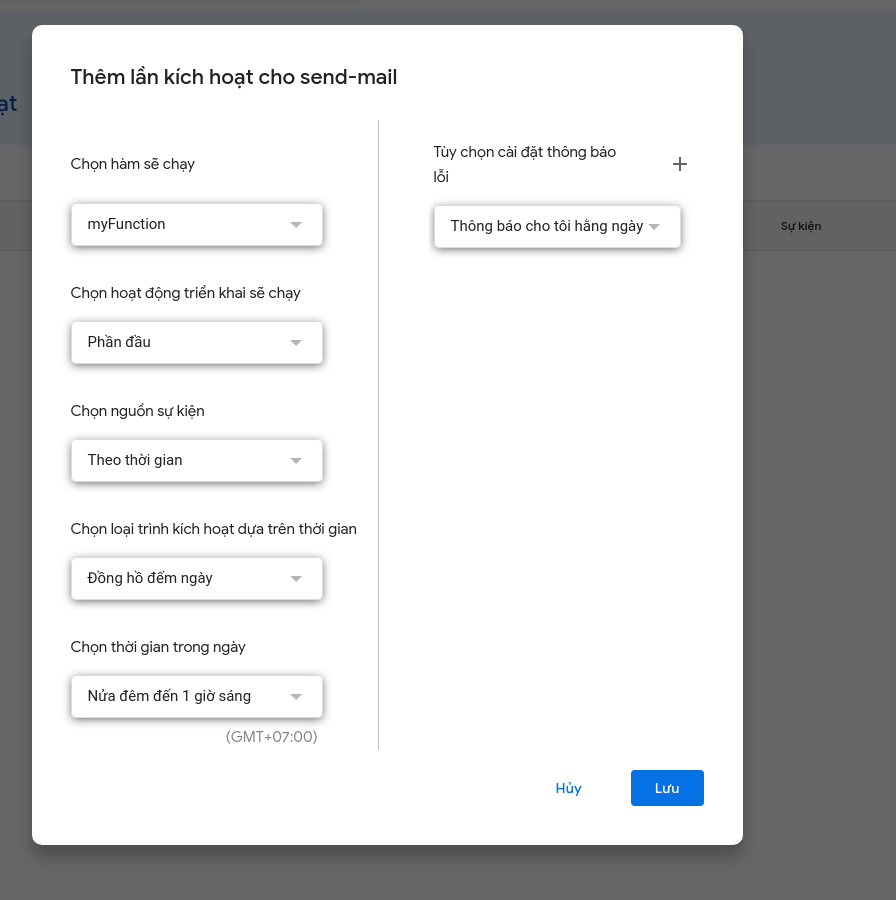 Modal setting hiện ra và bạn cài đặt các thông số nhé, như trên là mình cài cho code script chạy khoảng nửa đêm đến 1 giờ sáng đó.