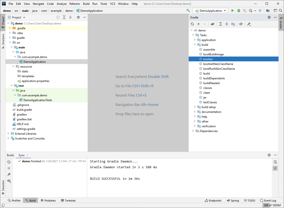 Để build thành file JAR, cần chạy các task tương ứng với package manager đã chọn. Nếu project dùng Maven cần chạy task jar, còn Gradle thì là bootJar.