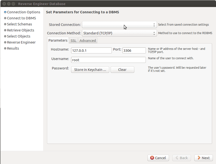 3. Tại cột Stored Connection chọn database từ danh sách thả xuống, sau đó chọn Next