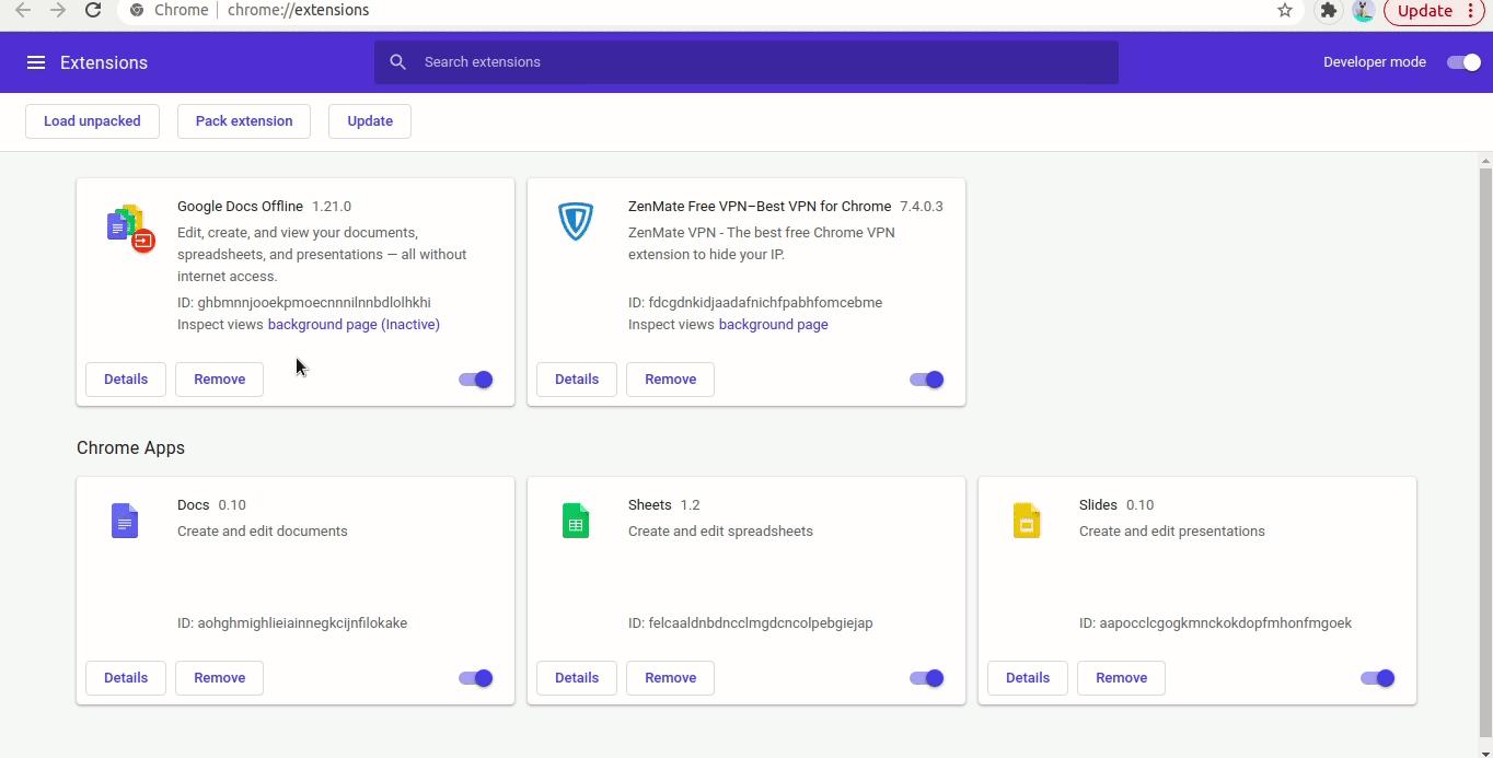 Và chúng ta sẽ vào menu Extension của Chrome và bật chế độ dev mode lên