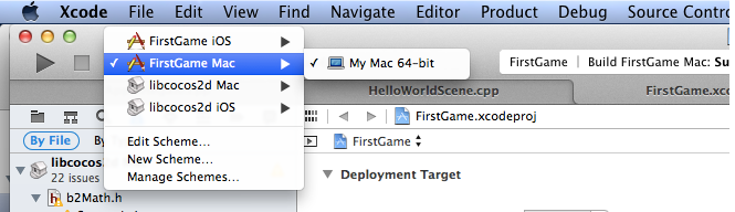 Để bắt đầu code trên MacOS, nhấp đúp vào .xcodeproj trong thư mục proj.ios_mac. Nó sẽ tự động mở Xcode cho bạn. Bây giờ ở thanh trên cùng, bạn sẽ có thể chọn project nào bạn muốn, iOS hoặc Mac. Vì iOS yêu cầu trình giả lập hoặc thiết bị để thực thi, nên tôi khuyến nghị bạn nên bắt đầu với Mac project.